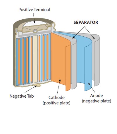 Lithium-ion batteries deliver power when charged atoms (ions) move from the anode, through the separator, to the cathode. The separator is a thin sheet of semi-porous plastic that insulates the anod from the cathode, while allowing ions to pass through.